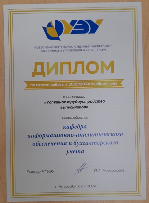По итогам 2023-2024 уч. года Кафедра ИАОиБУ НГУЭУ стала победителем в номинации «Успешное трудоустройство выпускников»!