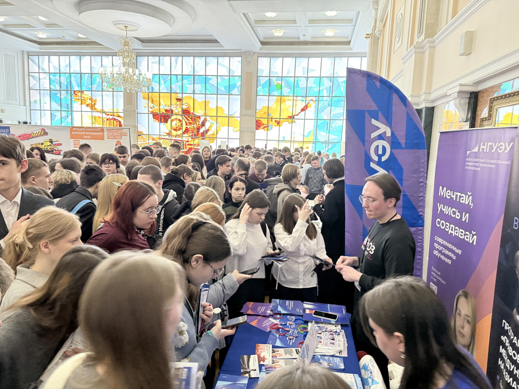 Для гостей выставка стала не только познавательной, но и увлекательной — вузы подготовили разнообразные интерактивные программы и мастер-классы. На стенде НГУЭУ посетителей встречали маскоты Ростик и Луна, которые создавали праздничную атмосферу и привлекали внимание школьников. Активисты Центра культуры и творчества, а также участники конкурса «Мисс и Мистер НГУЭУ» выступили с номером, исполнили гимн Нархоза, представив наш вуз в концертной части. В соцсетях школьники охотно делились фотографиями с того дня: